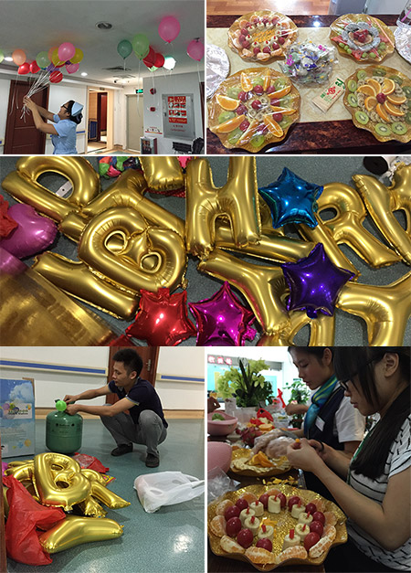 中午一点半,他们便到病区的护士站、咖啡吧,开始为各种物料的准备忙碌起来——充气球、绑带、拼盘……由于忙不过来,当天的值班护士姑娘,还开心地加入到他们的队伍。看着悬浮在天花板的彩