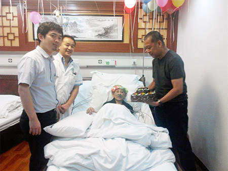 在欢快的生日歌声中,格蕾丝丈夫小心翼翼地端着两层太太喜欢吃的巧克力蛋糕,到达病床前祝太太生日快乐,早日恢复!