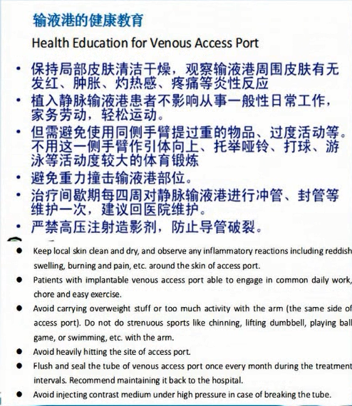 由于广州圣丹福医院患者大部分为国外患者,并且每个国家对静脉港的维护情况参差不齐的特殊性。为了更方便患者出院后也能降低静脉港非计划拔管率,广州圣丹福医院制作各国语言的书面宣教单,并对出院患者拍静脉港维护相片或视频,让患者带回当地医院对照护理。