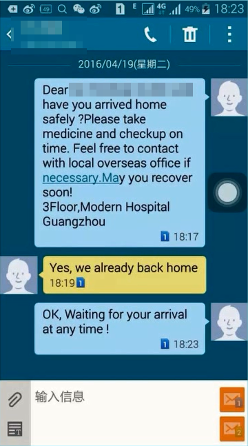 广州圣丹福医院大部分患者为海外患者,为了给这些海外患者提供全面的护理服务,在他们离院期间,护理人员采用互联网形式如短信、微信、QQ联络海外办事处人员回访等方式进行海外患者的延续护理服务。护理人员一般在患者出院后三天、入院前三天进行回访。