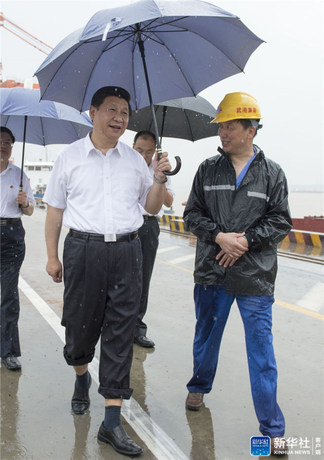 ▲2013年7月21日上午,习近平冒雨来到武汉新港阳逻集装箱港区考察。新华社记者 李学仁 摄