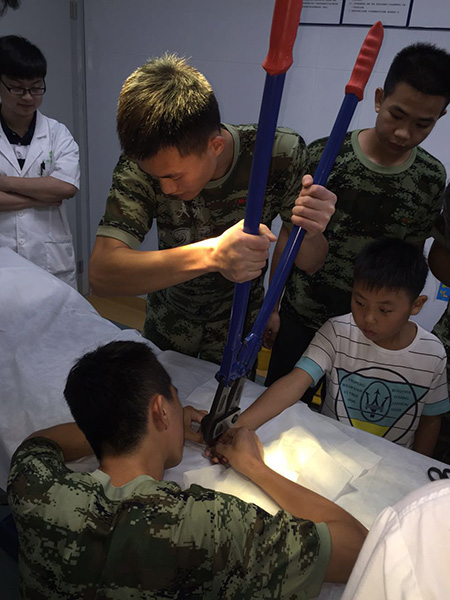 据悉,这名小男孩今年8岁,因为贪玩把铁环当作戒指套进了右手食指,结果被套紧了而取不出来。当孩子被送到医院,焦焱主任发现孩子右手食指已开始肿胀。焦焱主任先用冰块给孩子消肿,再用肥皂水,石蜡油,均无法摘除。焦主任立刻让陈素芳医生报警援助。