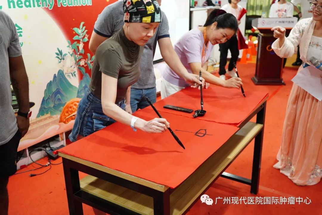 互动环节,肿瘤外科焦焱主任带患者做起了健康操,大家都积极参与,舒展自己的筋骨。医务部罗医生带领患者们练起了中华太极拳,患者们笨手笨脚的学着,却乐在其中。在欢乐中,让外籍患者及家属感受到了中国的文化习俗。医院领导易清华为患者们展示中国书法,带领他们共同书写“中秋团圆”四个字,有的外籍患者写得歪七扭八却异常认真开心。